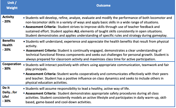 - Outcome A: Activity – acquire skills through a variety of developmentally appropriate movement activities.